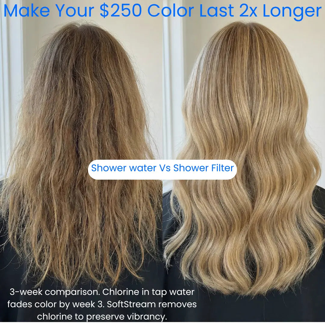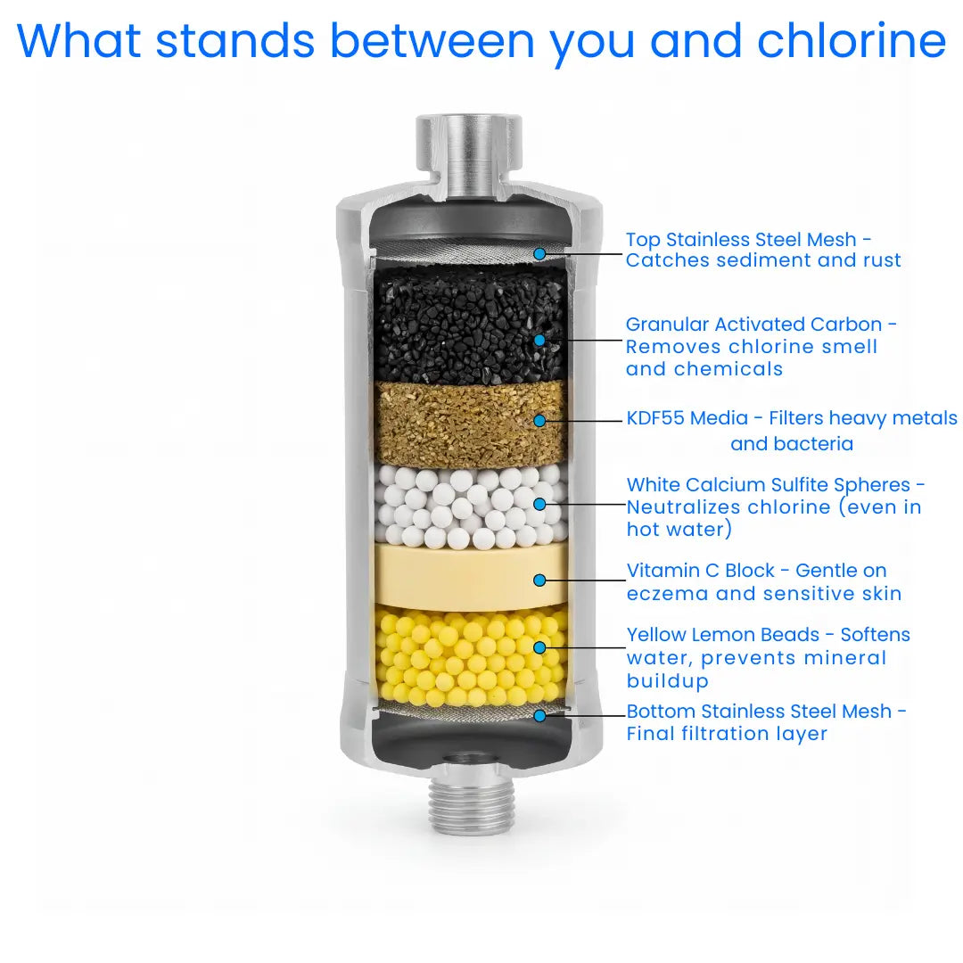 Our 7-stage filtration removes 98% of chlorine and reduces harsh minerals that damage hair and irritate skin.